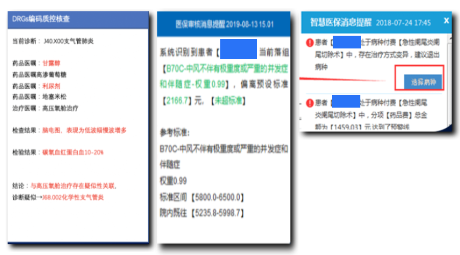 图3呈现了3个借助卫宁健康DRG系统提升医院DRG管理水平的案例。第一个案例,系统结合患者病情、检验检查结果、医嘱等数据,对患者的疑似诊断给出智能判断,当医生的诊断与系统判断的诊断不一致时,系统发出智能提醒,医生可结合实际情况选择是否修正诊断。第二个案例,系统根据每个病种的权重值,实时提醒医生费用是否超标。第三个案例,只要医生录入的诊断符合病种控费规则,系统就提醒或要求医生必须进入病种控费路径。通过各种智能提醒,避免医院因“低码高编”导致医保处罚的风险、因“高码低编”造成医保补偿的损失,从而建立一套完整的管理体系,实现DRG闭环管理。