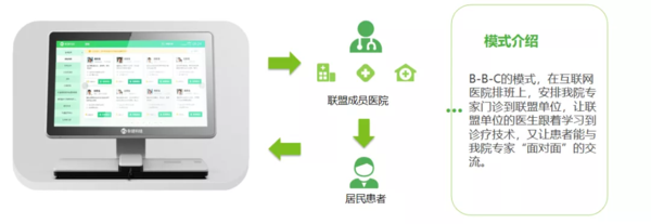 通过视频问诊终端,我们可以把我院诊疗水平较高的专家团队的专家门诊开设到联盟单位,比如每周二下午的专家门诊就是我院的专家坐诊,利用信息化手段实现专家和患者进行“面对面”的交流,联盟单位和我们互联网医院可以通过互联网医院推送排班信息给患者,方便患者进行线上预约挂号。
