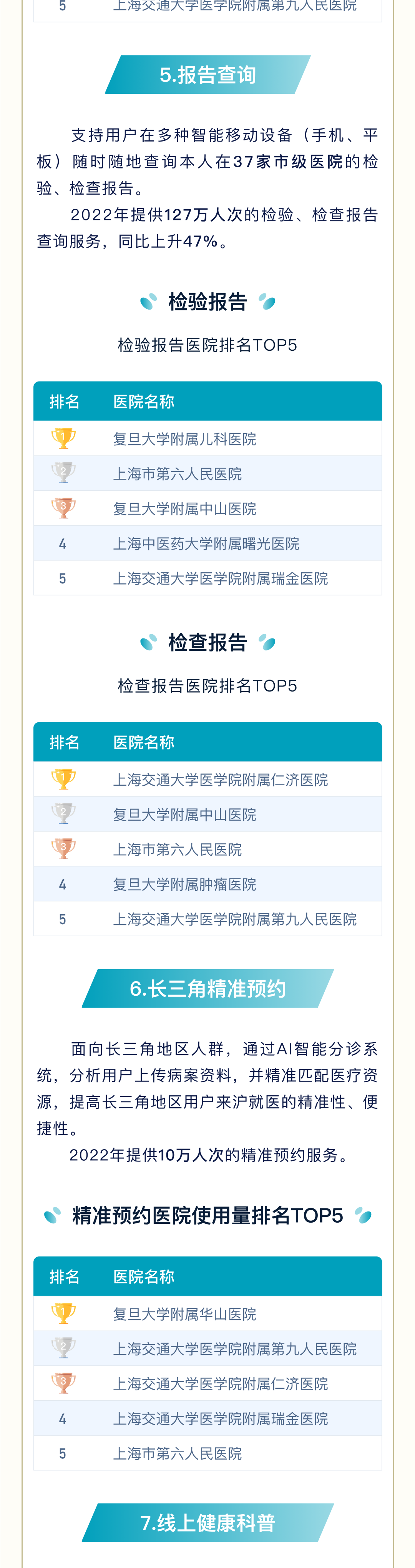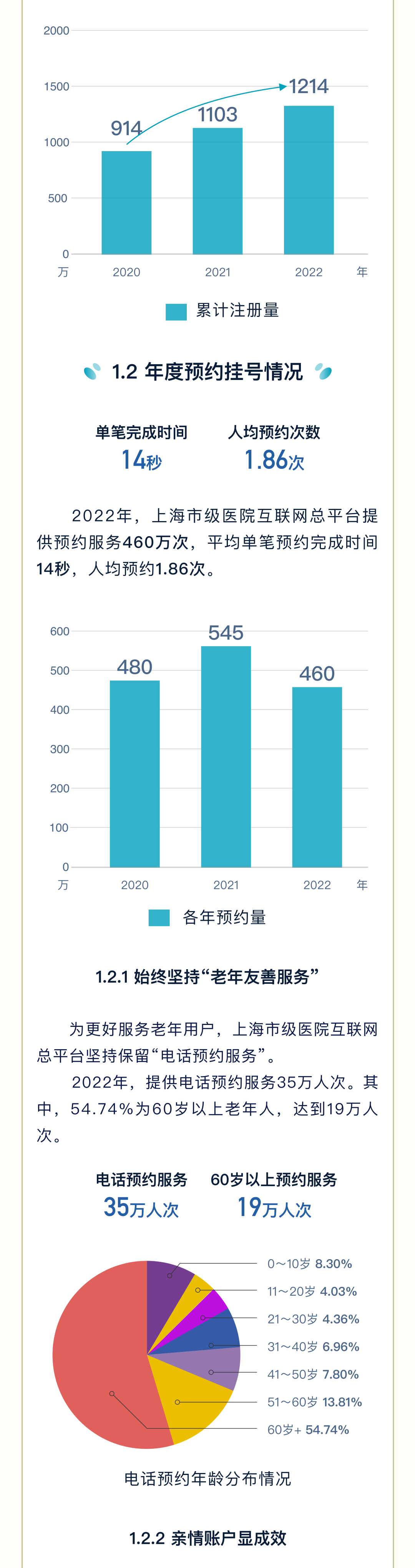 2022年,上海市级医院互联网总平台提供预约服务460万次,平均单笔预约完成时间14秒,人均预约1.86次。