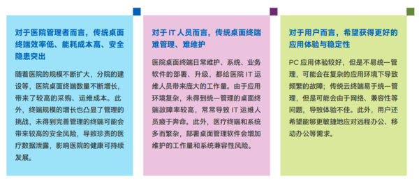 除了不同场景下的桌面终端对应着不同的需求,医院不同角色对于桌面终端也有着各自的应用痛点,这主要体现在以下几个方面:
