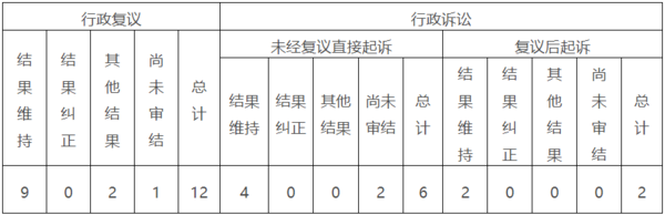 2023年我委本级涉及政府信息公开申请办理的行政复议申请12件;行政诉讼8件(未经复议直接起诉案件6件),无判令违法及败诉案件。
